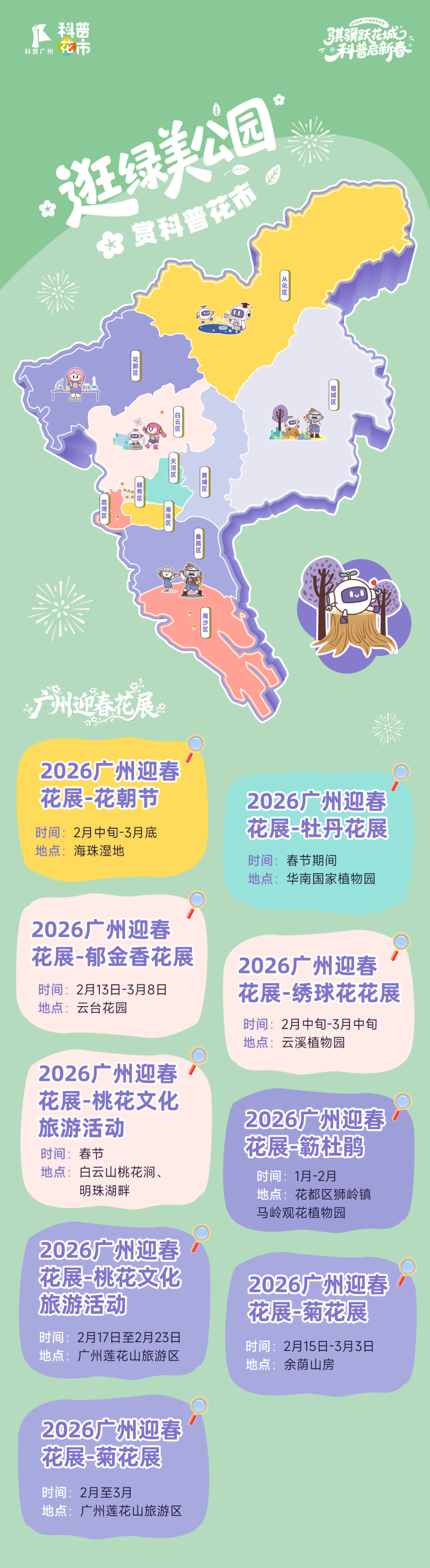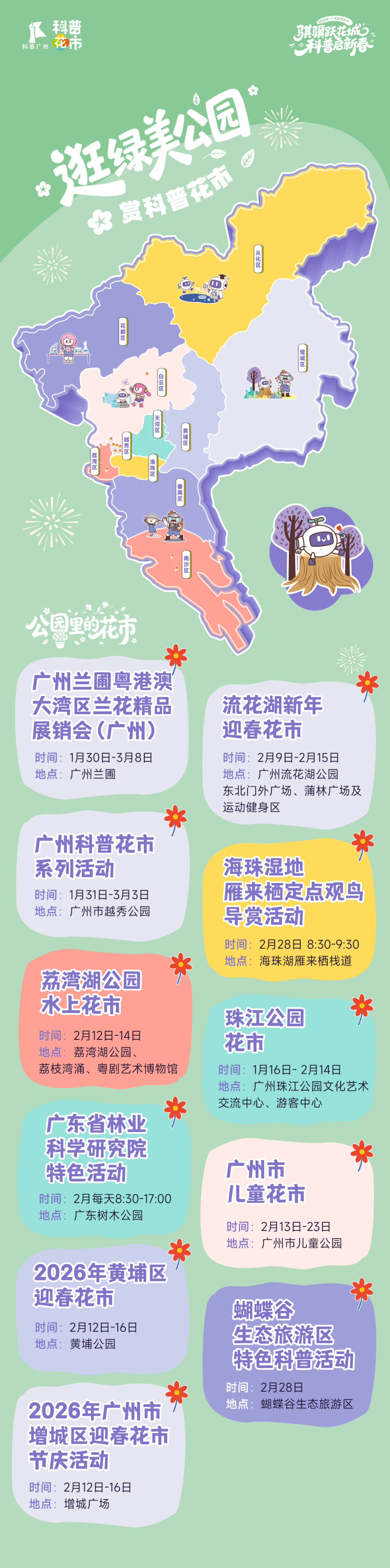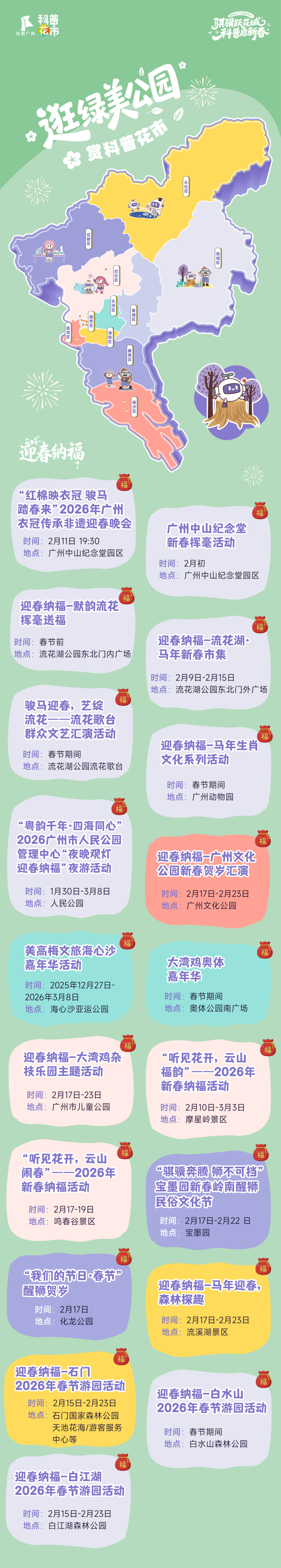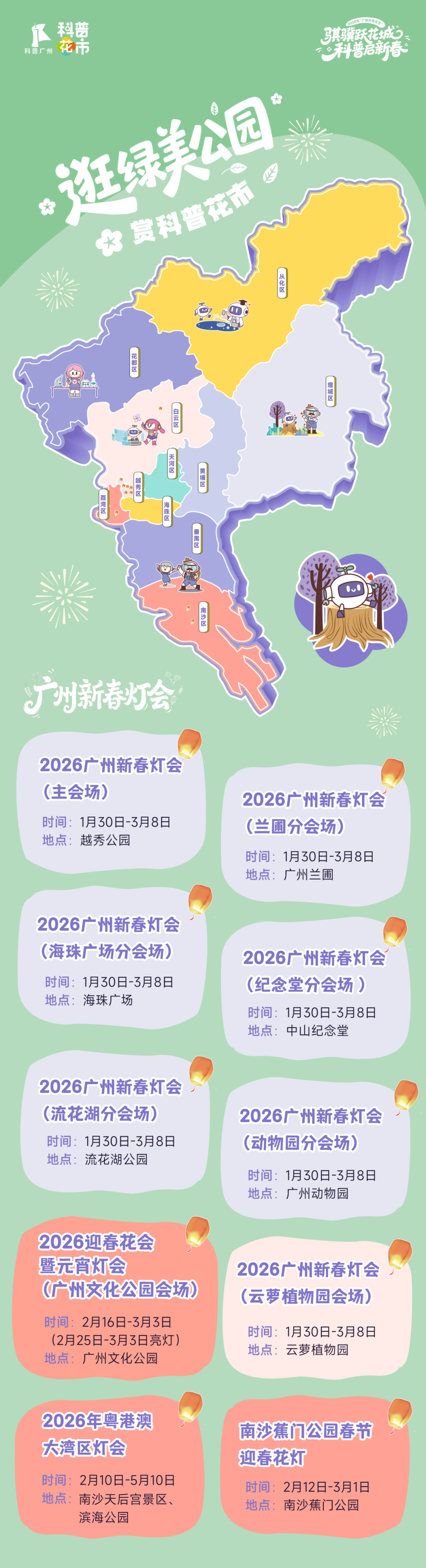 活动精心规划四大特色板块——赏璀璨灯会的“广州新春灯会”、品百花齐放的“广州迎春花展”、逛特色花市的“公园里的花市”、体验民俗纳福的“迎春纳福”。